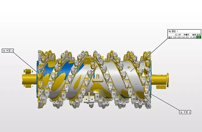 銑刨鼓是道路銑刨機的核心,需經(jīng)過嚴(yán)格的檢測,以避免磨損以及變形的負(fù)荷縮短設(shè)備使用壽命。過去采用接觸式打點來進(jìn)行檢測,不但測量速度慢,而且測量死角多,測量數(shù)據(jù)不全,且銑刨鼓的刀頭為活動刀頭,裝配后測量無法測得準(zhǔn)確的刀頭點位。