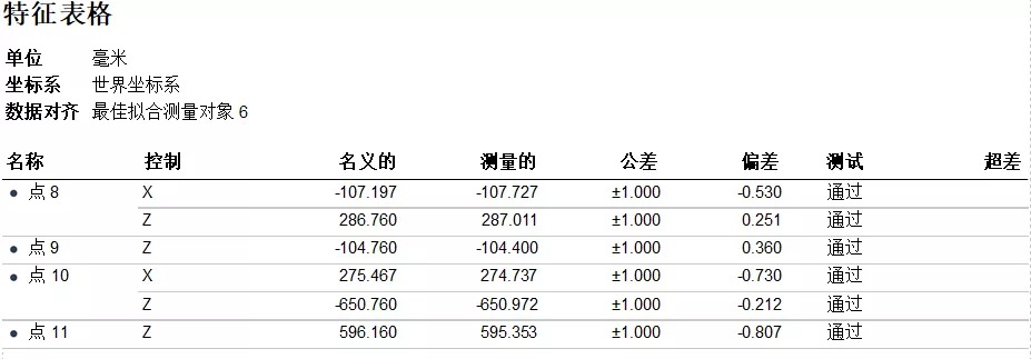 利用銑刨鼓兩端面、筒身特征約束XYZ平移自由度;點8、9、10、11四點約束YZ方向旋轉(zhuǎn)自由度。最后將掃描數(shù)據(jù)與CAD數(shù)模實現(xiàn)完全約束。(點8、9、10、11的單點偏差分別如下圖所示)