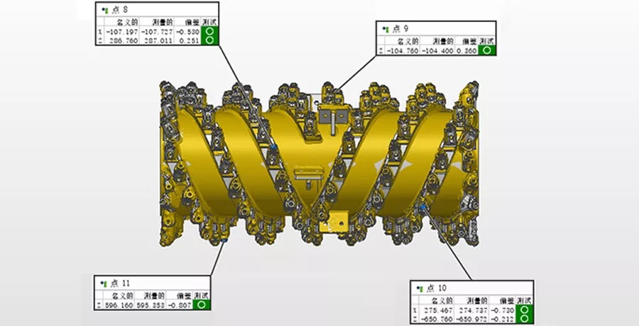 利用銑刨鼓兩端面、筒身特征約束XYZ平移自由度;點8、9、10、11四點約束YZ方向旋轉(zhuǎn)自由度。最后將掃描數(shù)據(jù)與CAD數(shù)模實現(xiàn)完全約束。(點8、9、10、11的單點偏差分別如下圖所示)